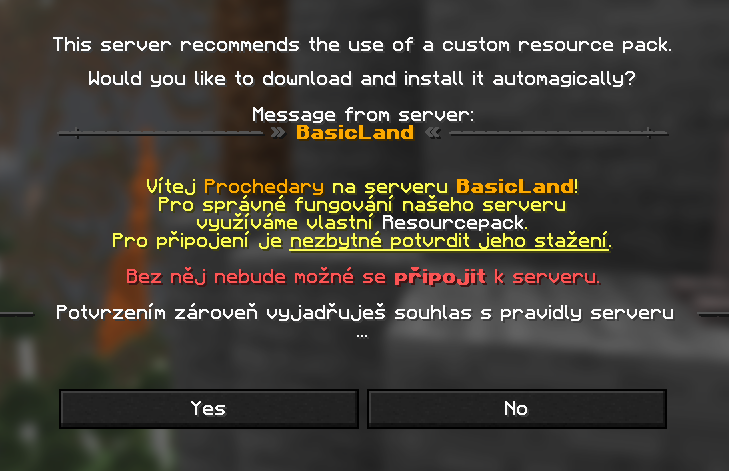 Stažení probíhá automaticky při připojování na server. Při připojování na serveru budete vyzvání na stažení a aktivování resource packu. Pokud odmítnete, tak na server nebudete vpuštění. Resource pack je tak povnný pro všechny hráče.